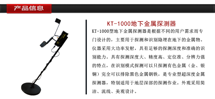 KT-1000特点: ●外壳采用高强度ABS工程塑料,具有强度高、重量轻、寿命长; ●能有效准确区别黑色金属和有色金属功能; ●可以排除黑色金属(钢铁)只探测有色金属(金、银、铜) ●设有地平衡线路,能消除“矿化反应”带来的影响,有效提高探测的深度及准确率; ●具有欠压工作报警装置; ●采用重复的充电电池进行工作; ●通过喇叭或耳机识别探测金属声音。
